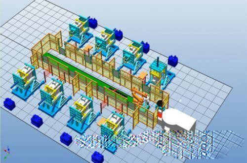該生產(chǎn)模式是手工下芯-鑄機合模-機器人勺取鋁液澆注-鑄機翻轉(zhuǎn)產(chǎn)品凝固-自動開模頂出-機器人取件-機器人抓取工件打碼-機器人放傳送帶冷卻-機器人抓取工件清理-機器人抓取工件放傳送帶-機器人抓取工件進行X光檢測。