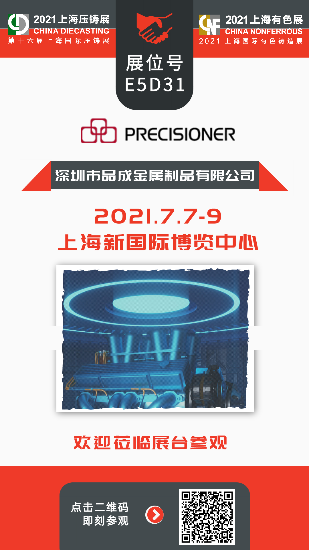 品成金屬將于2021年7月7日-9日參加第十六屆上海國(guó)際壓鑄展&2021上海國(guó)際有色鑄造展,展位號(hào)為E5D31。該展會(huì)將全方位展示壓鑄及有色鑄造全產(chǎn)業(yè)鏈解決方案,促進(jìn)企業(yè)相互學(xué)習(xí)、交流碰撞和集智發(fā)展,引領(lǐng)行業(yè)未來發(fā)展新趨勢(shì)。現(xiàn)誠(chéng)邀各位行業(yè)人士蒞臨我們的展位參觀,品成全體員工恭候您的到來,一起攜手挑戰(zhàn),共創(chuàng)未來!