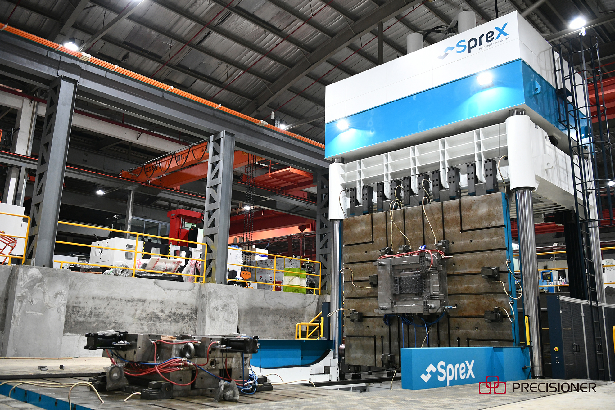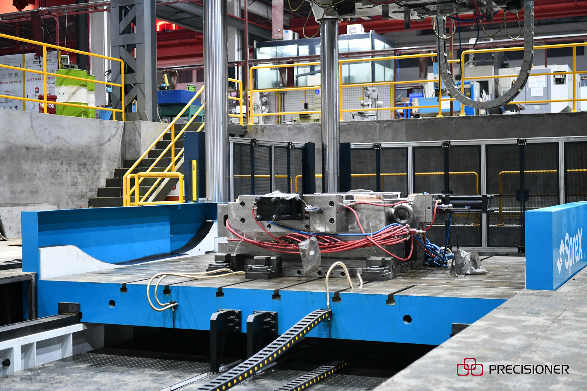800T大型合模機(jī)可容模尺寸為4.2×3.5M,合模重量190T,翻轉(zhuǎn)能力105T,可以配4000-8000T的模具。該臺(tái)合模機(jī)體量較大,機(jī)身11.9米約三層樓高,占地約100平方米,現(xiàn)場(chǎng)觀摩大型合模機(jī)工作畫面相當(dāng)壯觀。