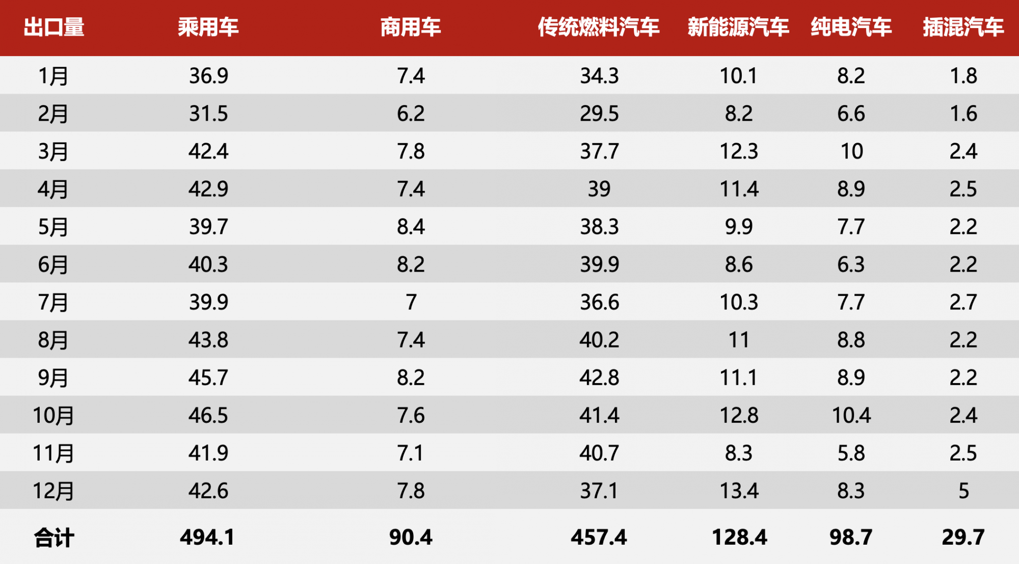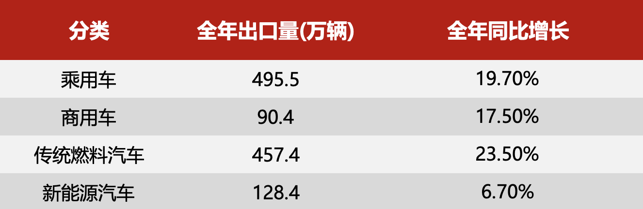 ◎ 乘用車全年出口量達(dá)到 495.5 萬輛,同比增長了 19.70%;