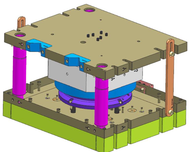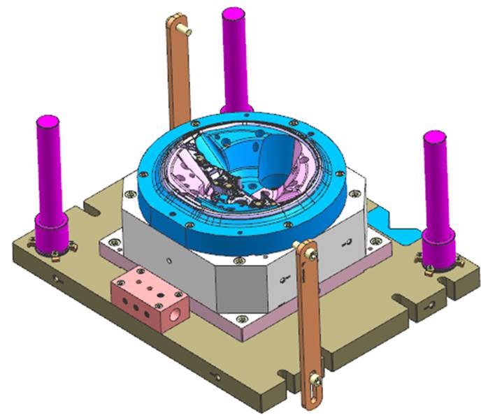 本公司設計的方向盤修飾模具,采用了全包圍式的結構設計,通過下模定位,上模沖剪的結構,實現(xiàn)了方向盤生產(chǎn)過程的穩(wěn)定和精度要求;其特征主要體現(xiàn)在: