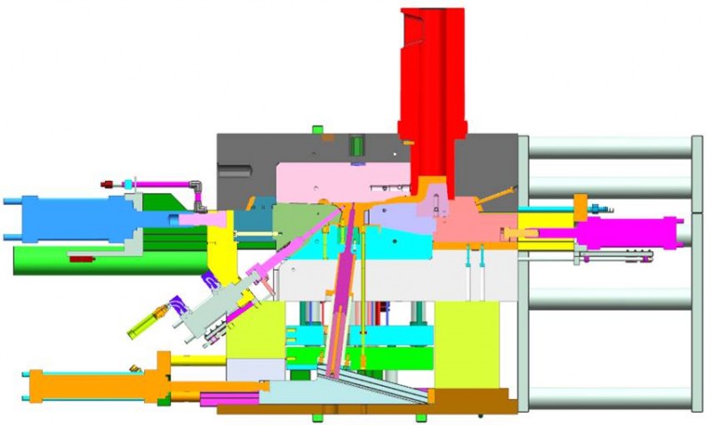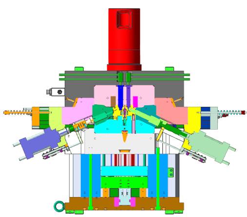 動模部分的行位內(nèi)有較斜度孔位成型,這樣的大角度使得如何設計固定行位使行位鑲針不退位,使行位穩(wěn)定運行尤為重要,如圖所示,此項目我們采用液壓+機械行位,依靠機械力固定行位結構,經(jīng)測試驗證,
